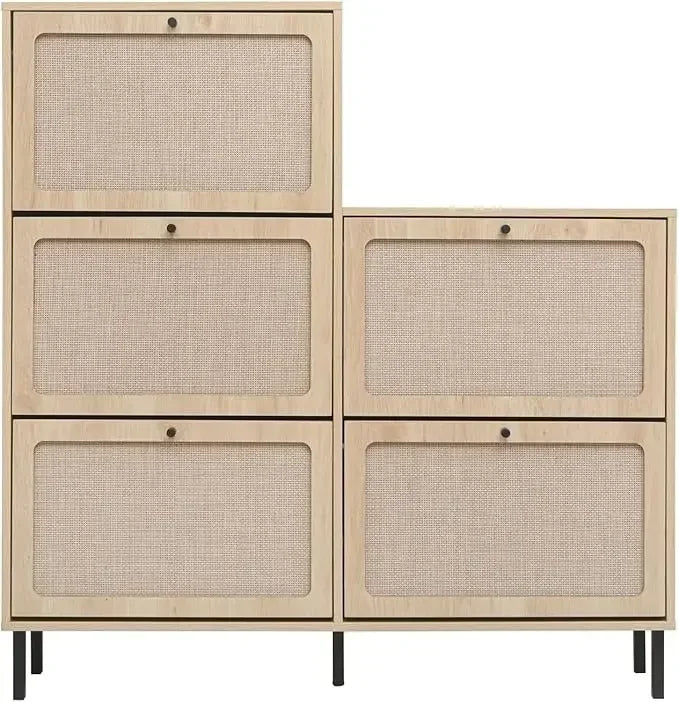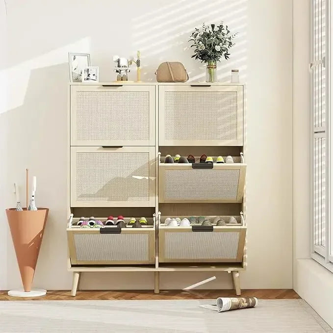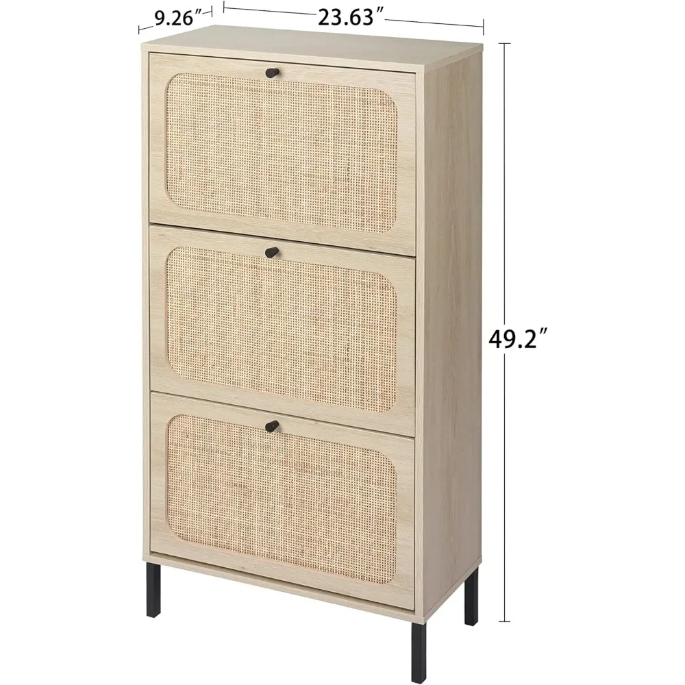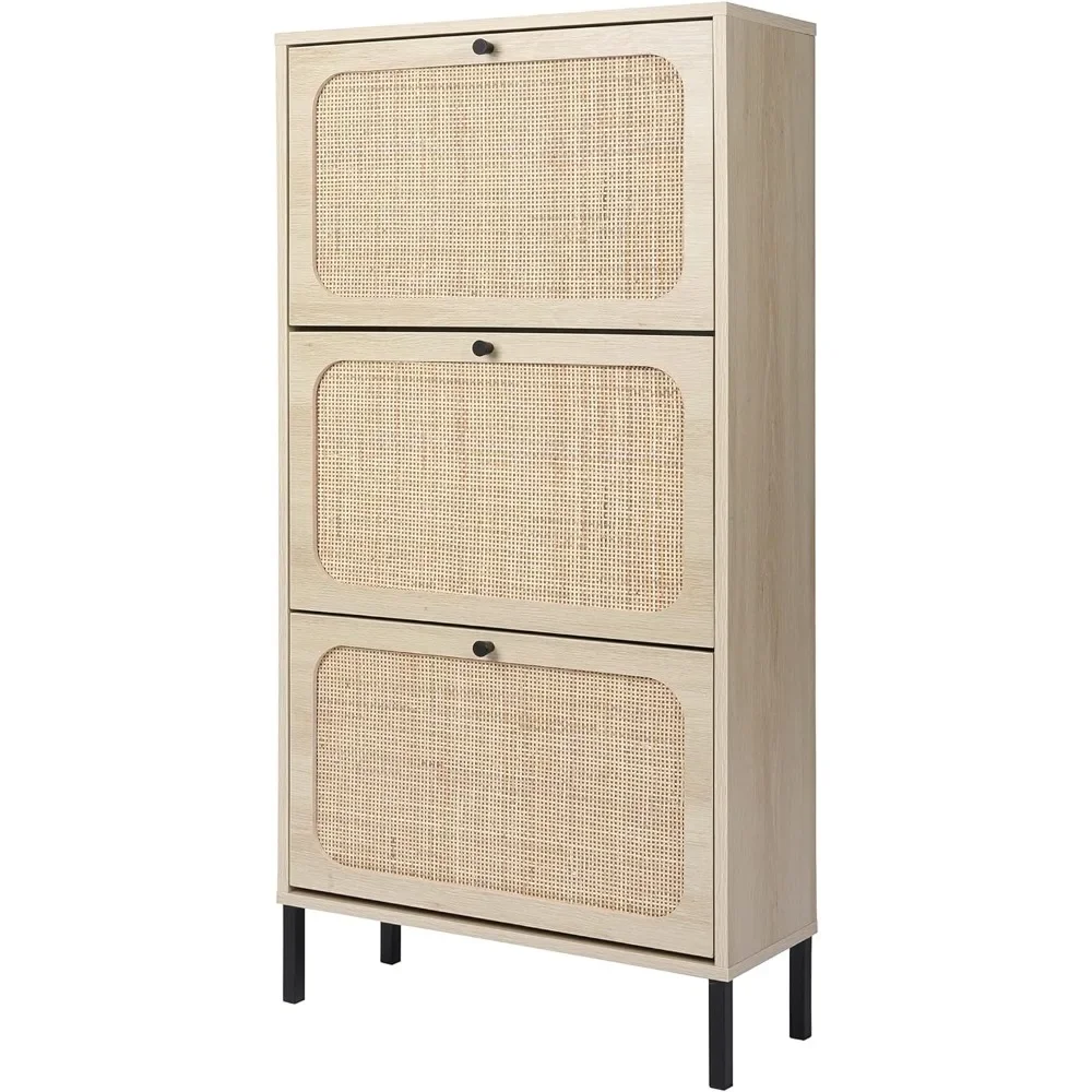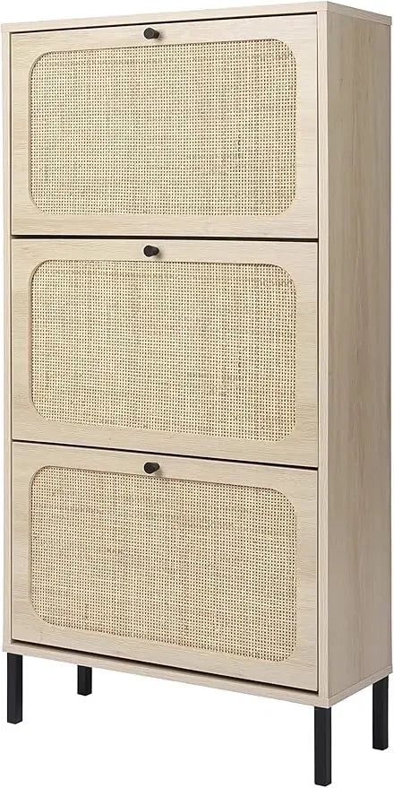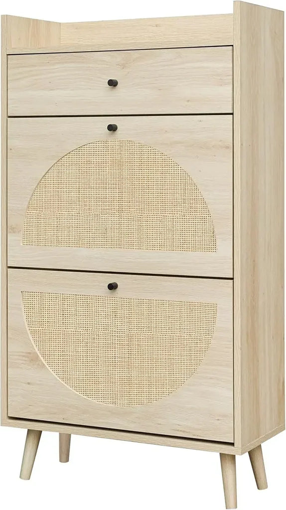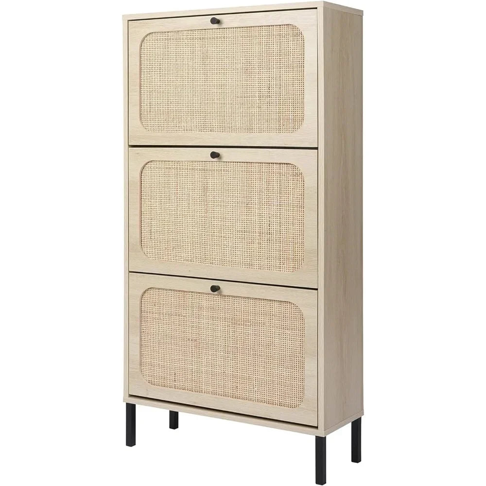 Natural Rattan Cabinet with 3 Flip Drawers, Free Standing Modern 3-Tier Shoe Storage Rack for Heels, Slippers