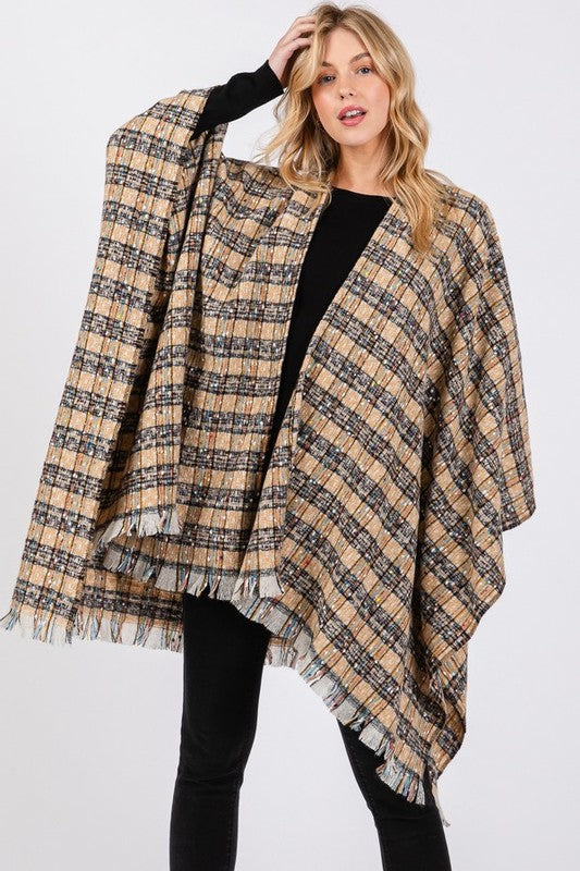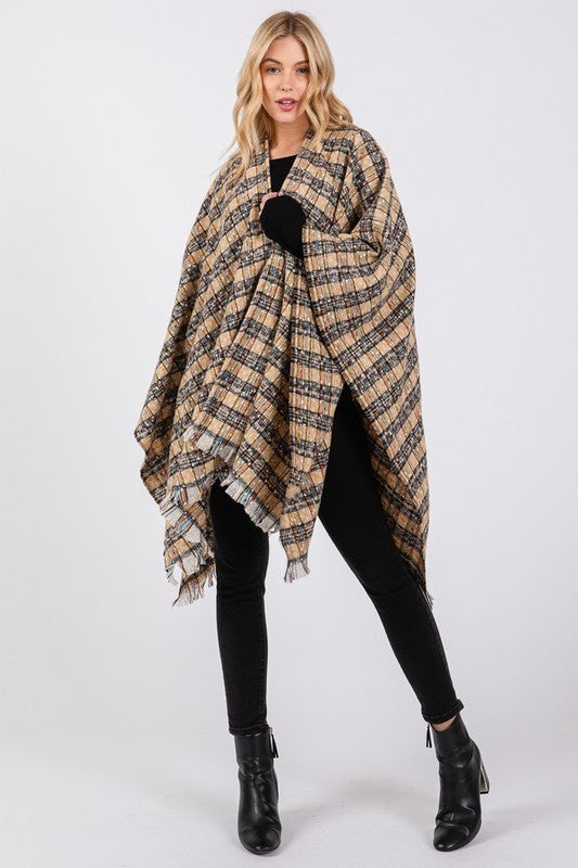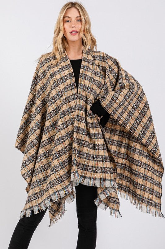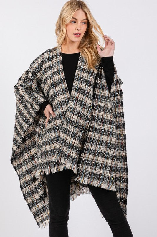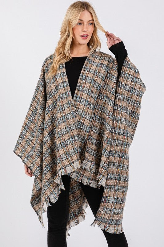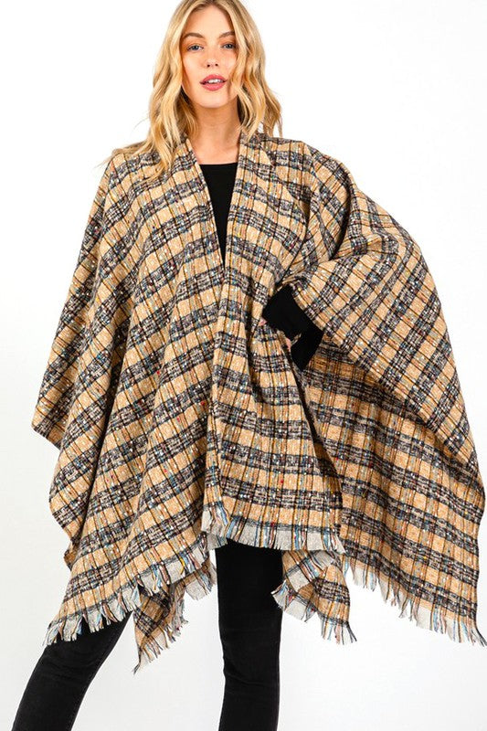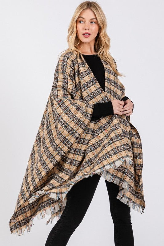Oversize Plaid Raw Edge Ruana Cardigan