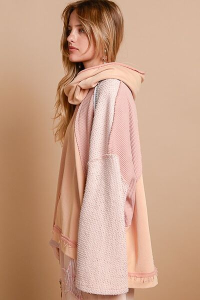 The Exposed Seam Turtleneck Stud Trim French Terry Hoodie is a trendy and stylish hoodie featuring exposed seams, a cozy turtleneck design, and stud trim detailing. Made from French Terry fabric, this hoodie combines comfort with fashion, making it a versatile choice for casual wear. The exposed seams add a modern and edgy touch to the design, while the stud trim embellishment adds a hint of sophistication and glamour. Perfect for staying cozy and chic, this hoodie can be easily paired with your favorite jeans or leggings for a fashionable and comfortable outfit. Elevate your casual style with the Exposed Seam Turtleneck Stud Trim French Terry Hoodie for a cool and trendy look.