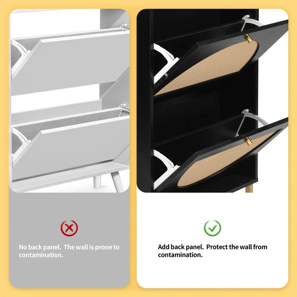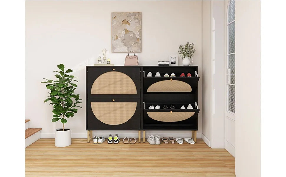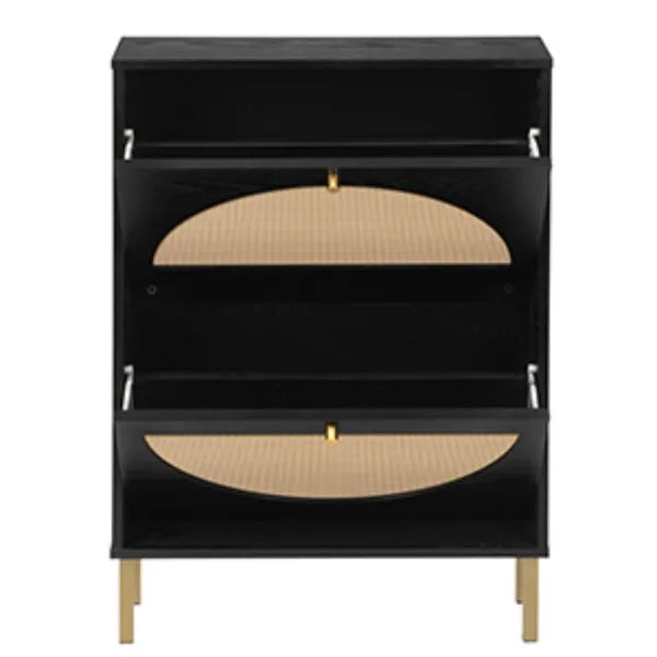 - This Rattan Shoe Cabinet with 2 Flip Drawers is a perfect combination of modern design and retro charm. Golden handle, elegant, comfortable to hold, more smooth to open and close.