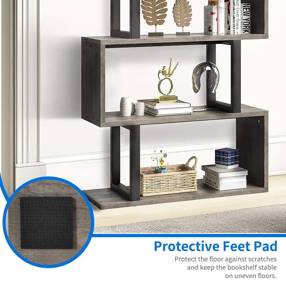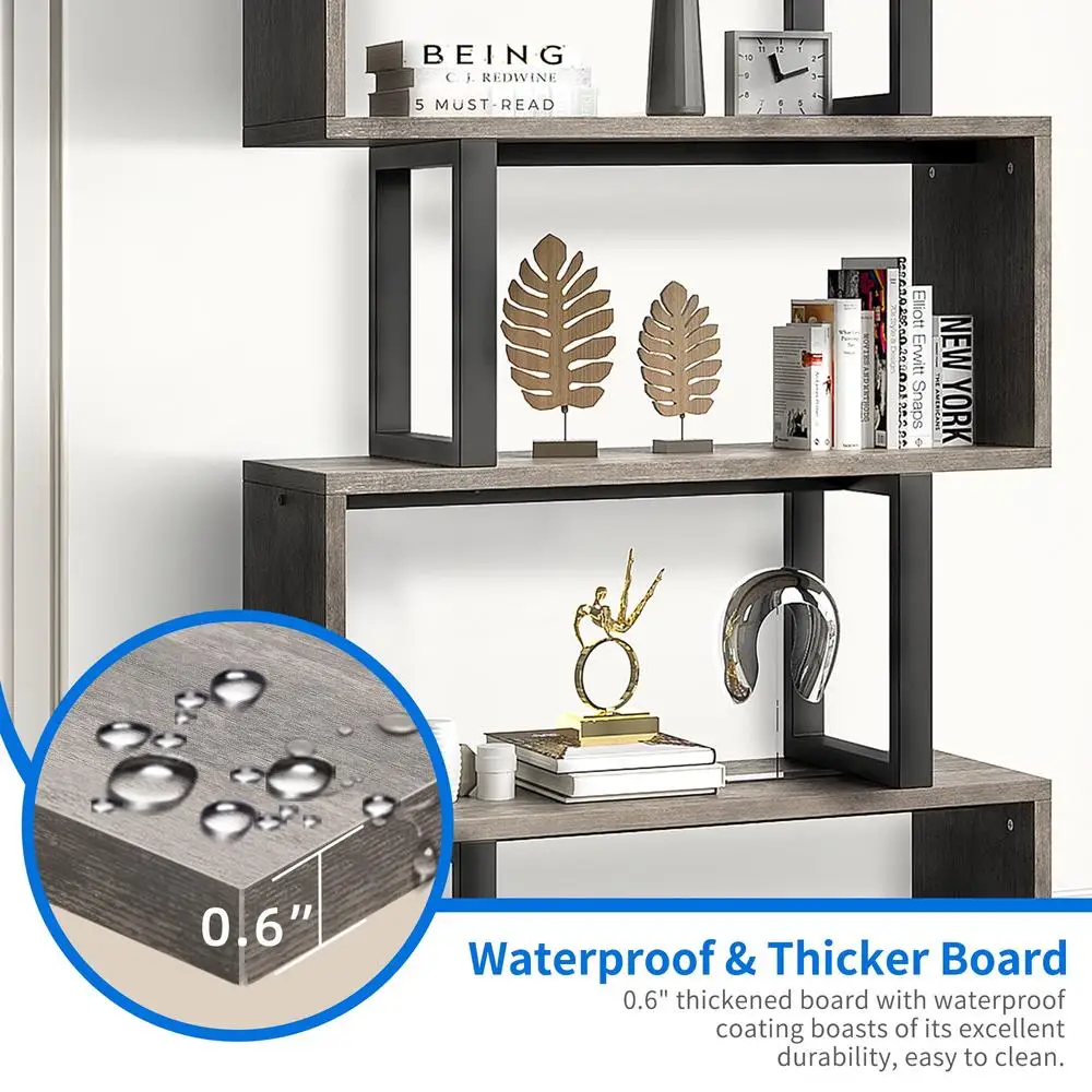 Unique S-shape design makes this bookshelf a work of art 5-tier storage space satisfies various needs Made from superior waterproof particle board and powder coating metal frame for enhancing lifespan Equipped with anti-fall kit for family safety and product stability The cross bar at the bottom of each shelf improves bearing capacity The non-slip leg pads protect the floor against scratches and keep the bookshelf stable on uneven floors