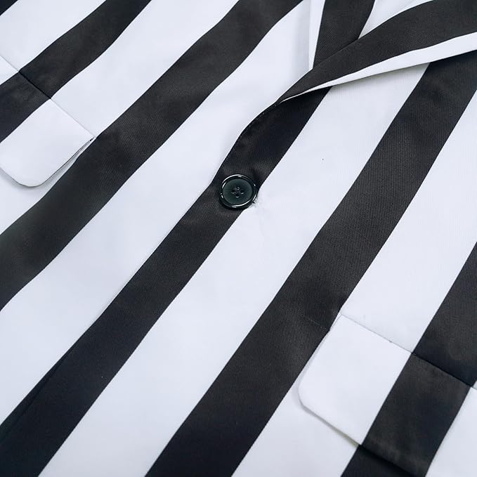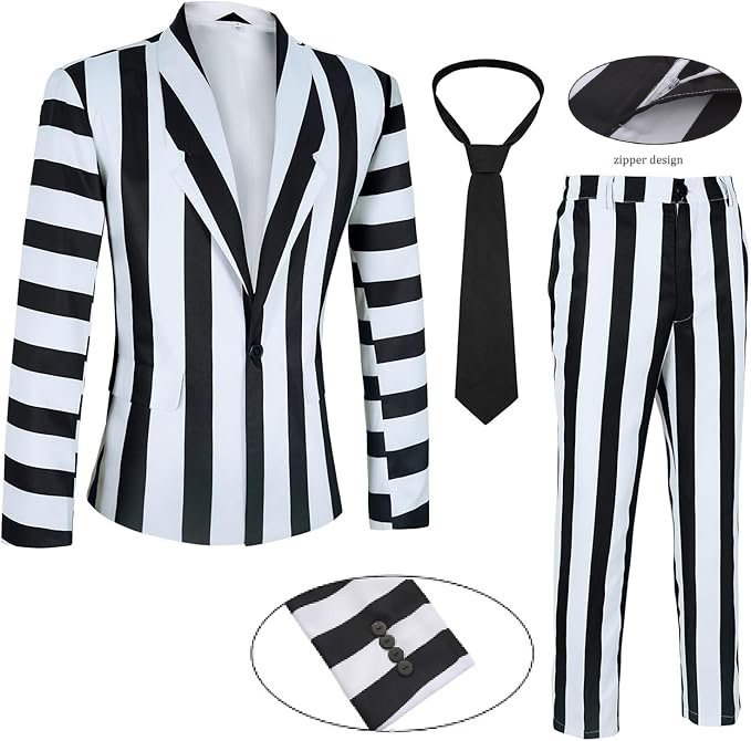 Complete 3-Piece Elegance: Everything you need for an instant transformation! This all-in-one set includes the iconic striped blazer, matching trousers, a crisp white dress shirt, and a classic tie for a perfectly coordinated Addams Family look.