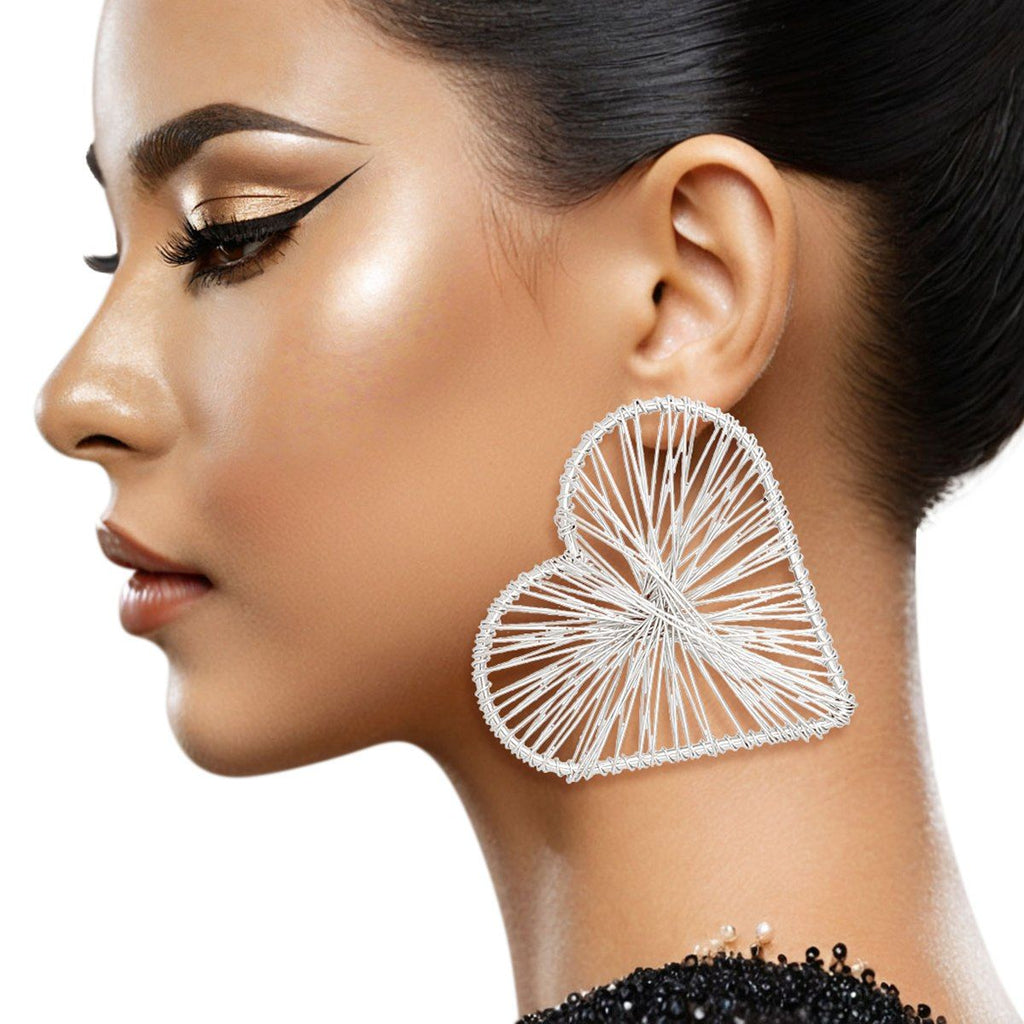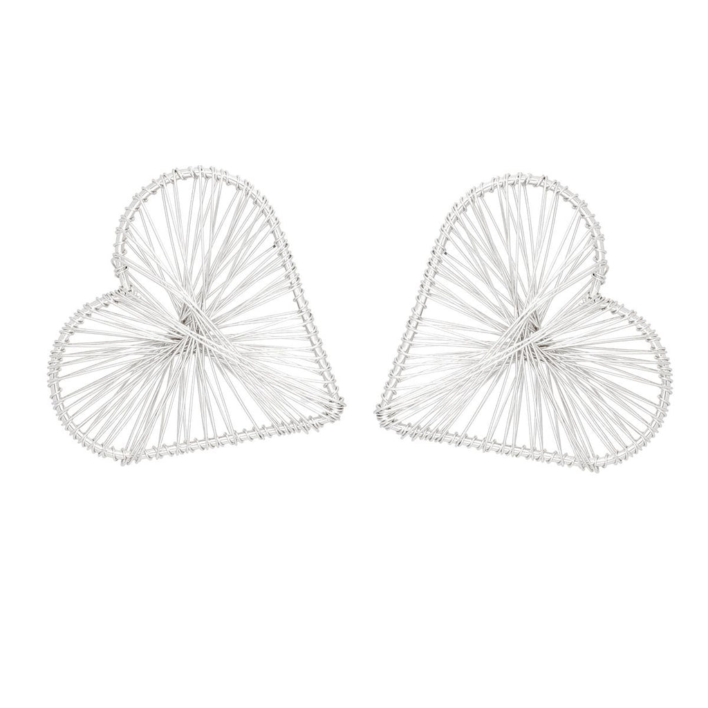 Women's Large Stud Earrings. Silver Metal Heart Angled Stud Earrings Featuring Wire Wrapped Detailing. Earrings Measure 13.5mm wide. Post Backing.