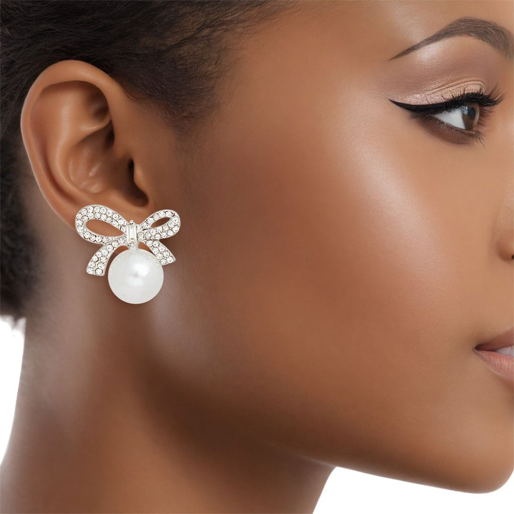 Women's Stud Earrings. Silver Metal and Clear Rhinestone Ribbon Bow Shaped Studs Featuring Acrylic White Pearl Detail. Pearl Measures 11mm. Post Backing.