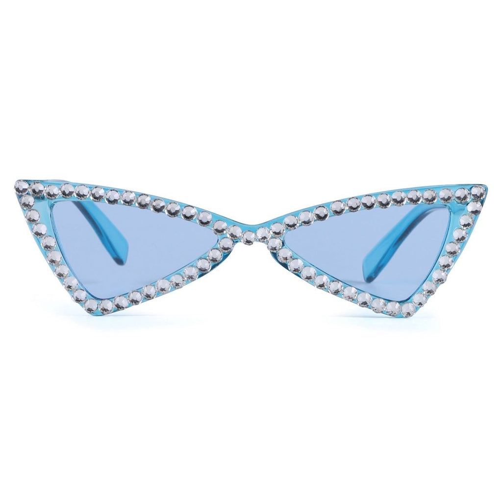 Women's Cat Eye Sunglasses. Vintage Geometric Pointed Blue Plastic Retro Cat Eye Sunglasses Featuring Matching Color Tinted Lens and Clear Rhinestone Edge Detailing. PC Material. UV 400 Protection. Blocks 100% UVA & UVB. Temple to Temple Width 5.75". Length 1.55".