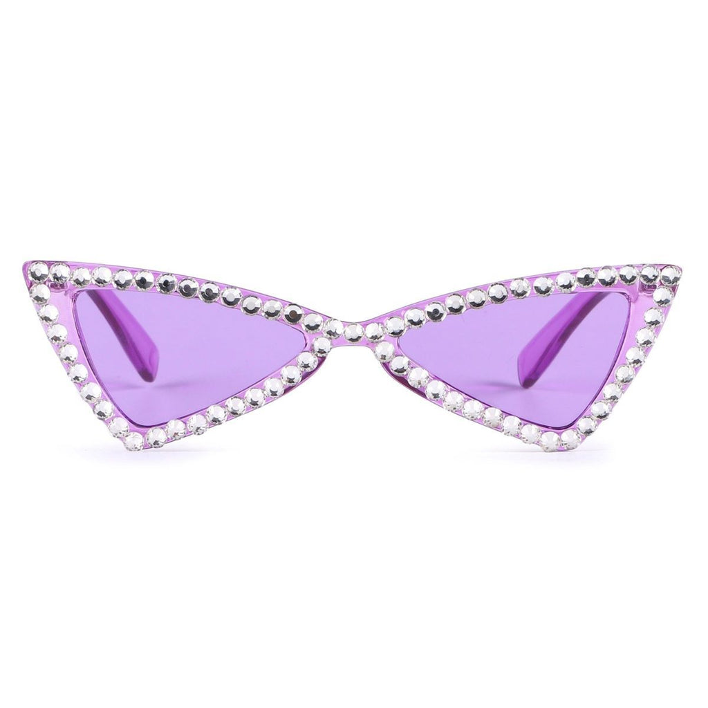 Women's Cat Eye Sunglasses. Vintage Geometric Pointed Purple Plastic Retro Cat Eye Sunglasses Featuring Matching Color Tinted Lens and Clear Rhinestone Edge Detailing. PC Material. UV 400 Protection. Blocks 100% UVA & UVB. Temple to Temple Width 5.75". Length 1.55".