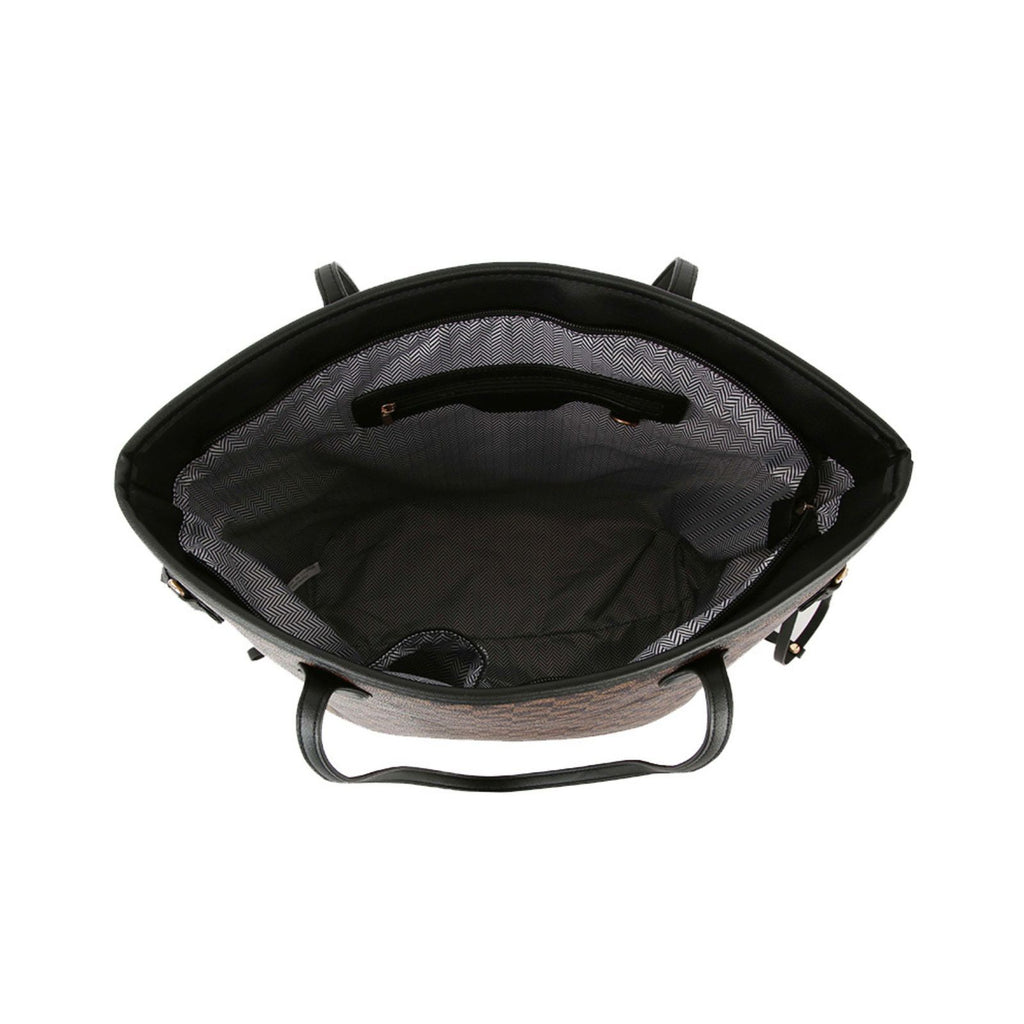 Women's Tote Shoulder Bag Set. Medium Brown and Dark Brown Vegan Faux Leather Tote Shoulder Bag Featuring Monogram Diamond Plaid Pattern and Black Faux Leather Trim. Main Zipper Closure. Rear Zipper Pocket. Lined Interior. Adjustable Side Cinch Straps. Includes Large 11" x 8.25" Zipper Pouch and Zipper Wallet with Center Zipper Pocket and Card Slots. 3 Pcs Set.