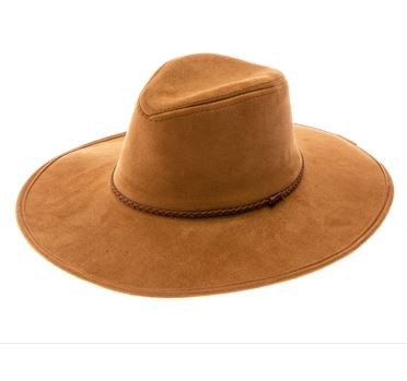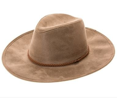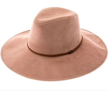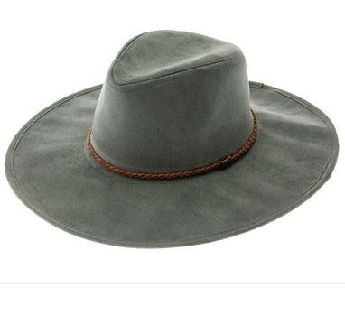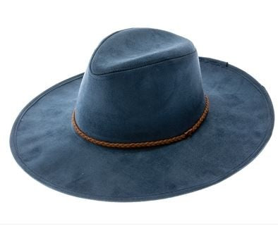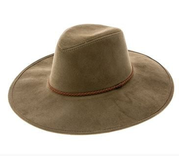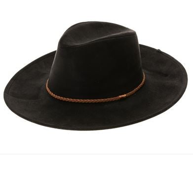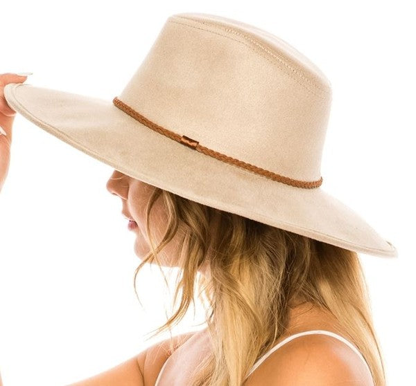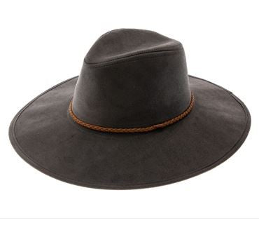 Faux suede wide brim panama hat with braided band and stiff brim.
