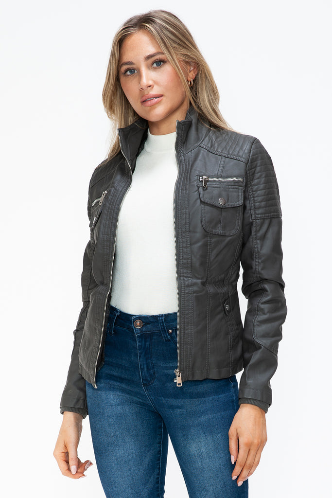 YMI Removable Faux Layered Multi-Pocket Jacket with Fuzzy Hood